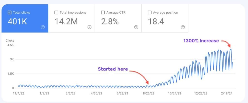 Remarkable 1300% increase in total clicks, marking an extraordinary surge in traffic.