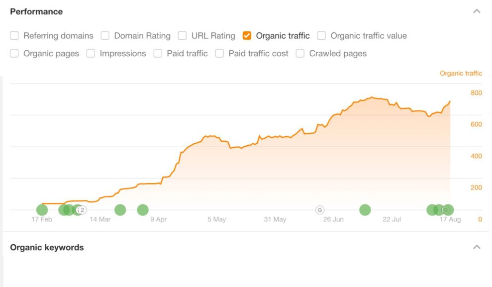 significant upward trend, with traffic starting low (around 100-200) and climbing to nearly 800 by August.